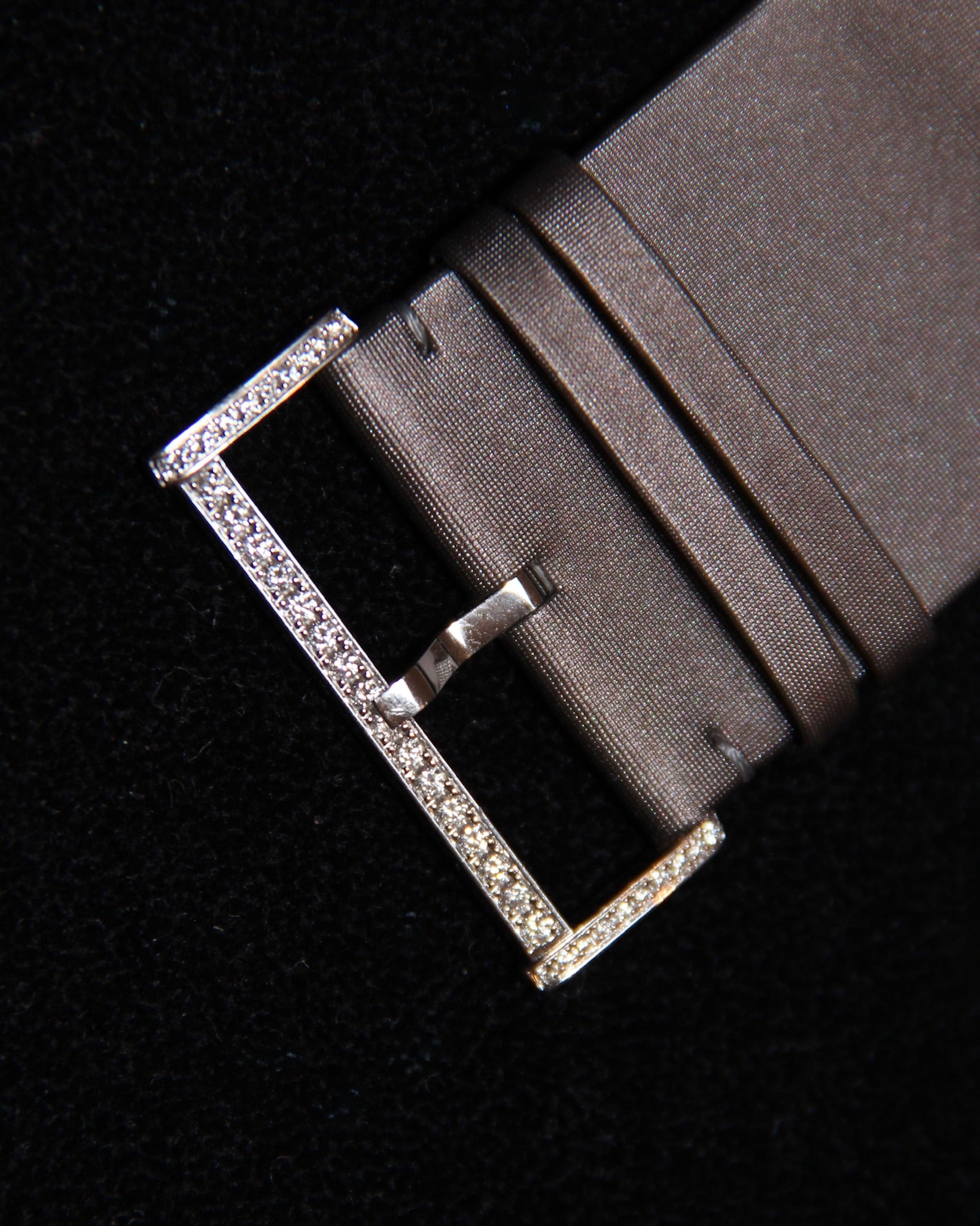 La Cartier Tank Divan Diagonale Réf. 2786 incarne une interprétation audacieuse et sophistiquée de l’icône Tank. Son boîtier allongé en or blanc 18 carats (750) se distingue par une géométrie diagonale rare, sublimée par un sertissage de diamants minutieux qui souligne l’élégance de sa silhouette.