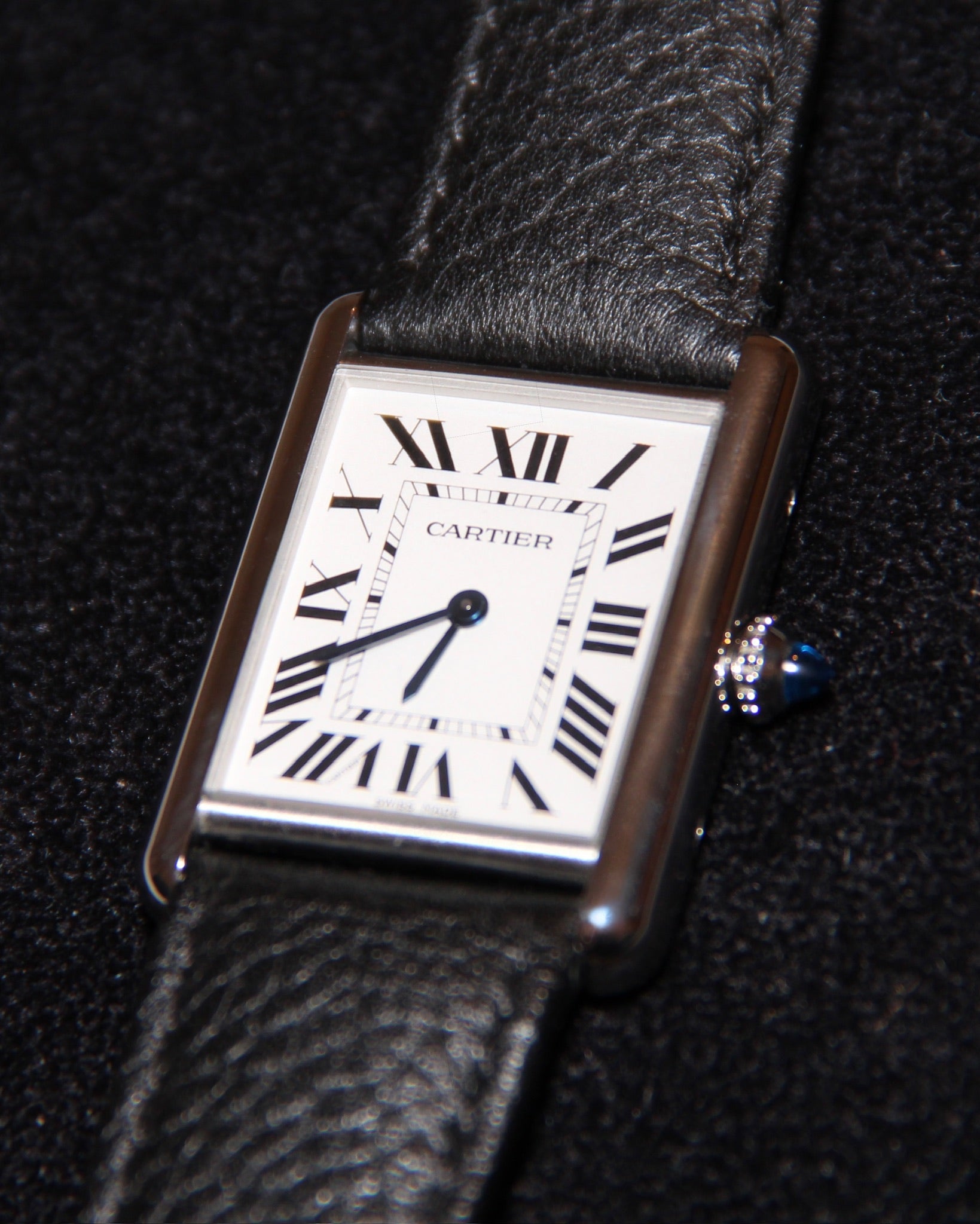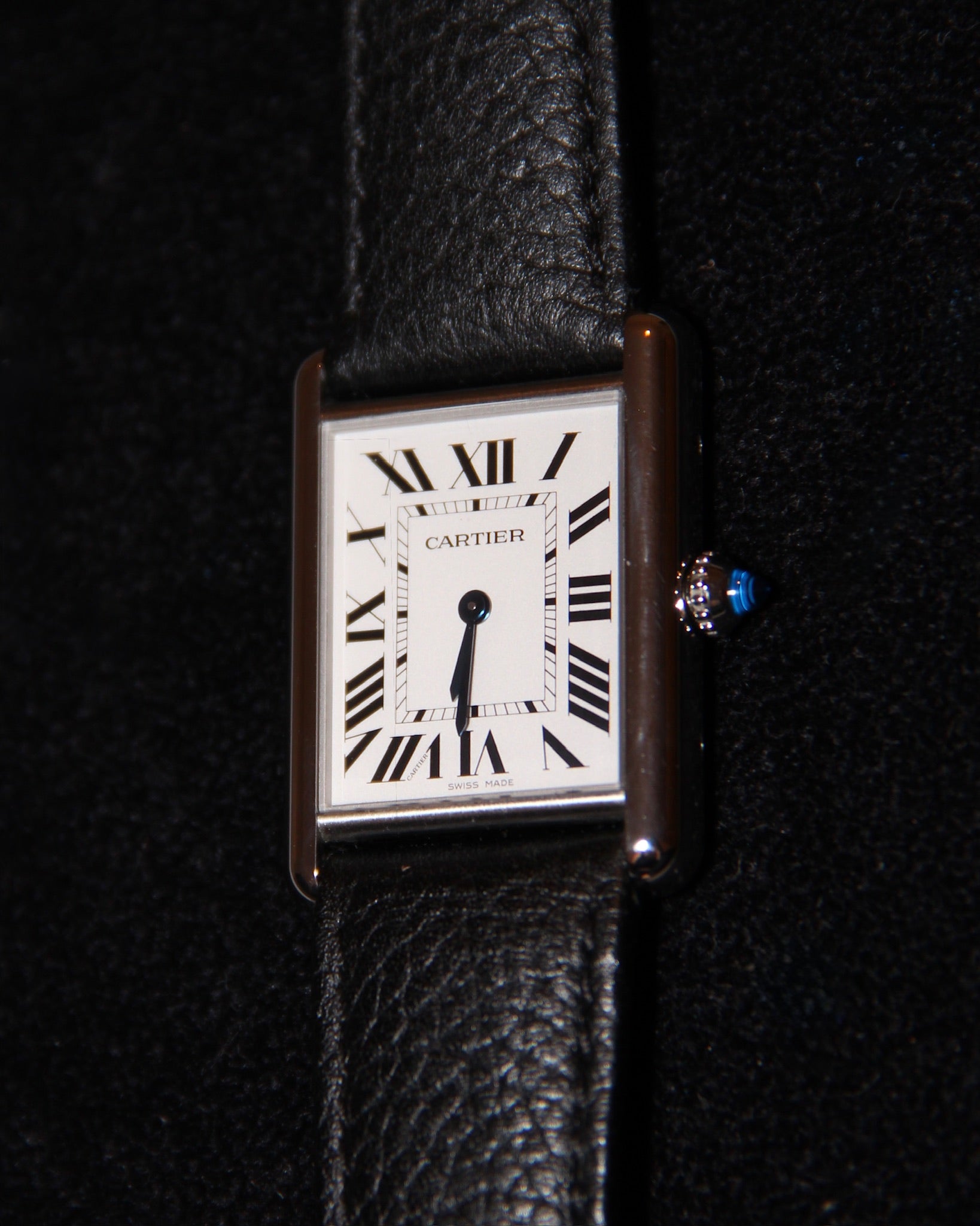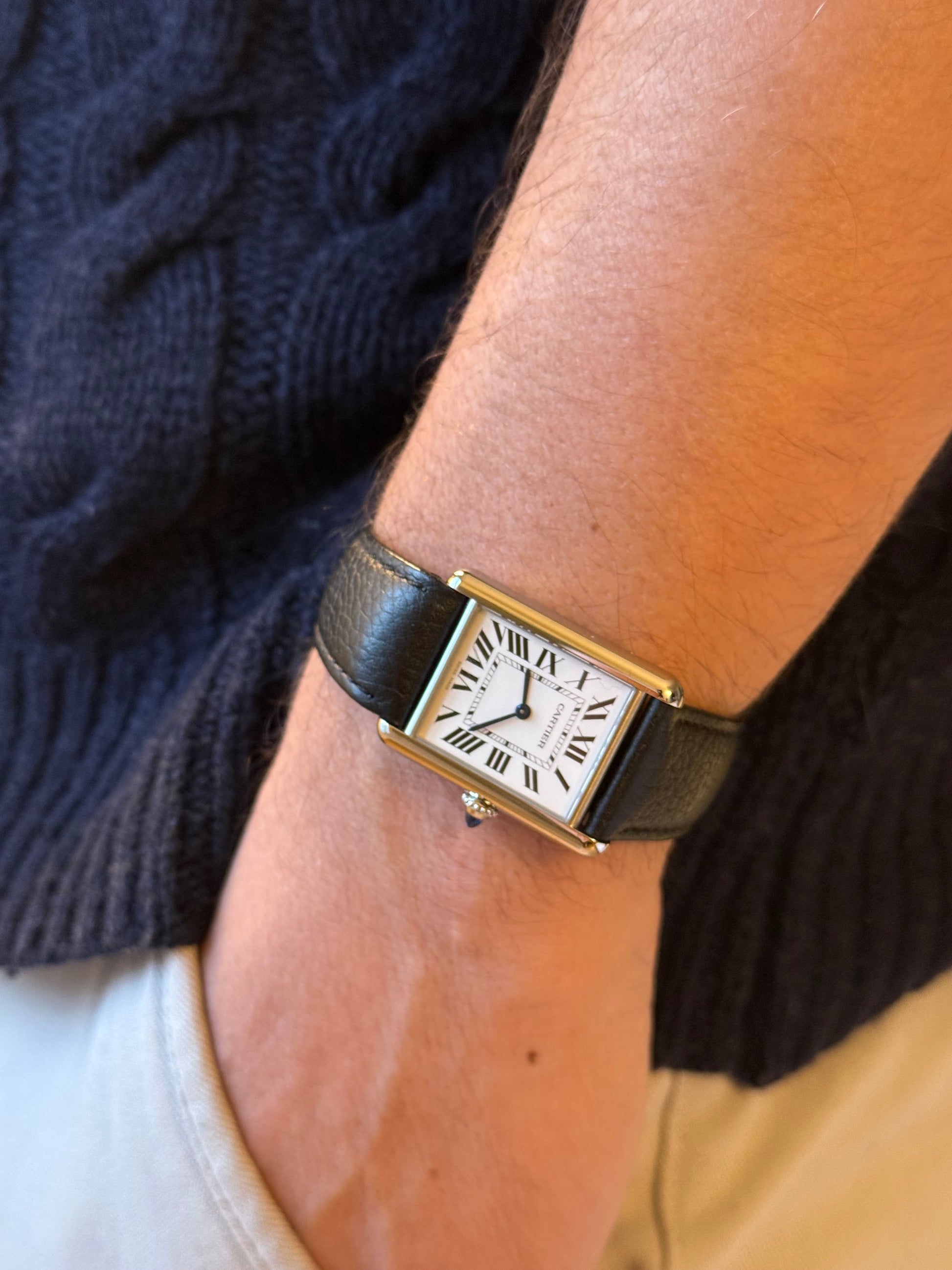 Inspirée du design original de la Tank Louis Cartier, cette version “Large” se distingue par son boîtier en acier poli, ses aiguilles bleuies et son cadran argenté à chiffres romains, immédiatement reconnaissable.