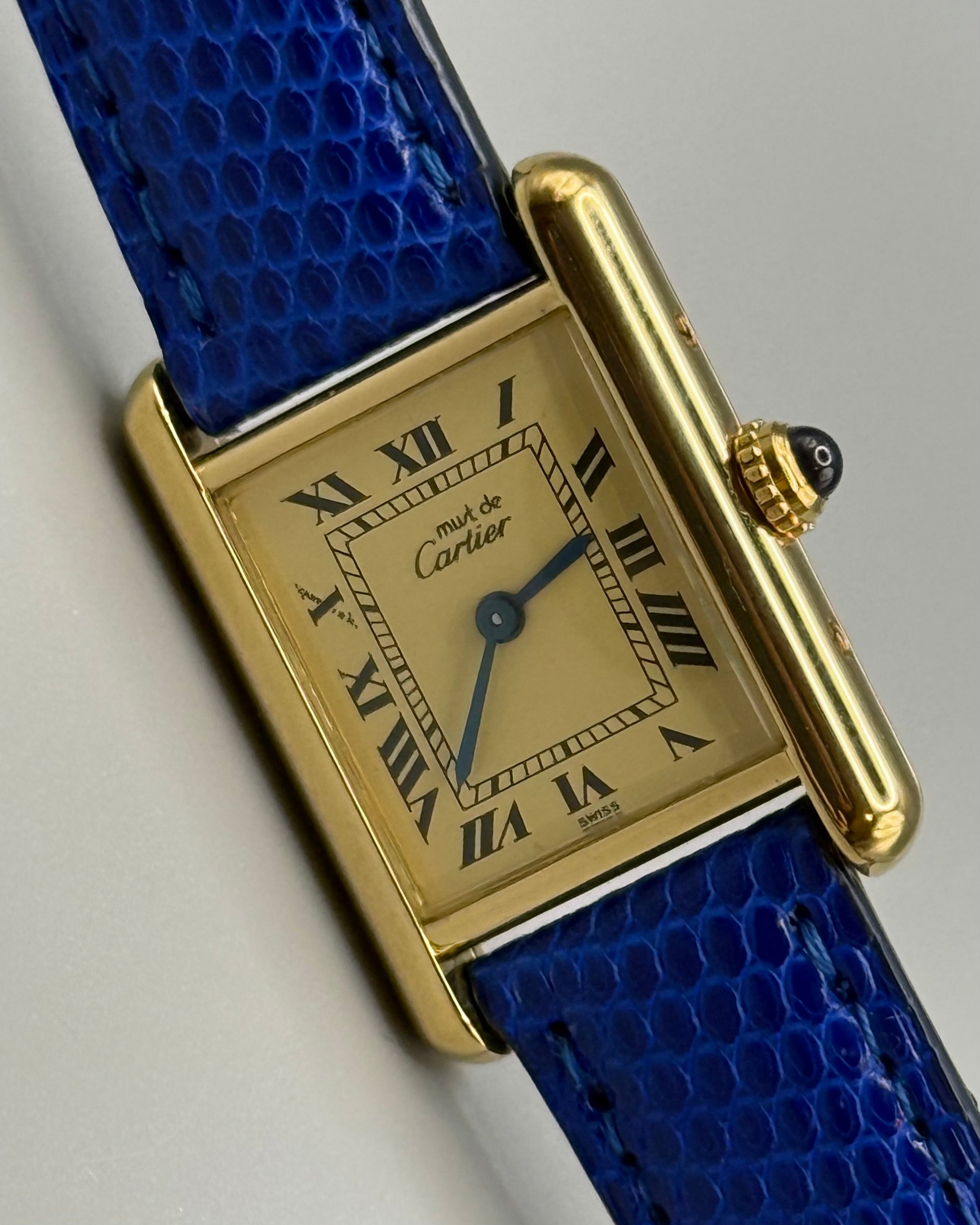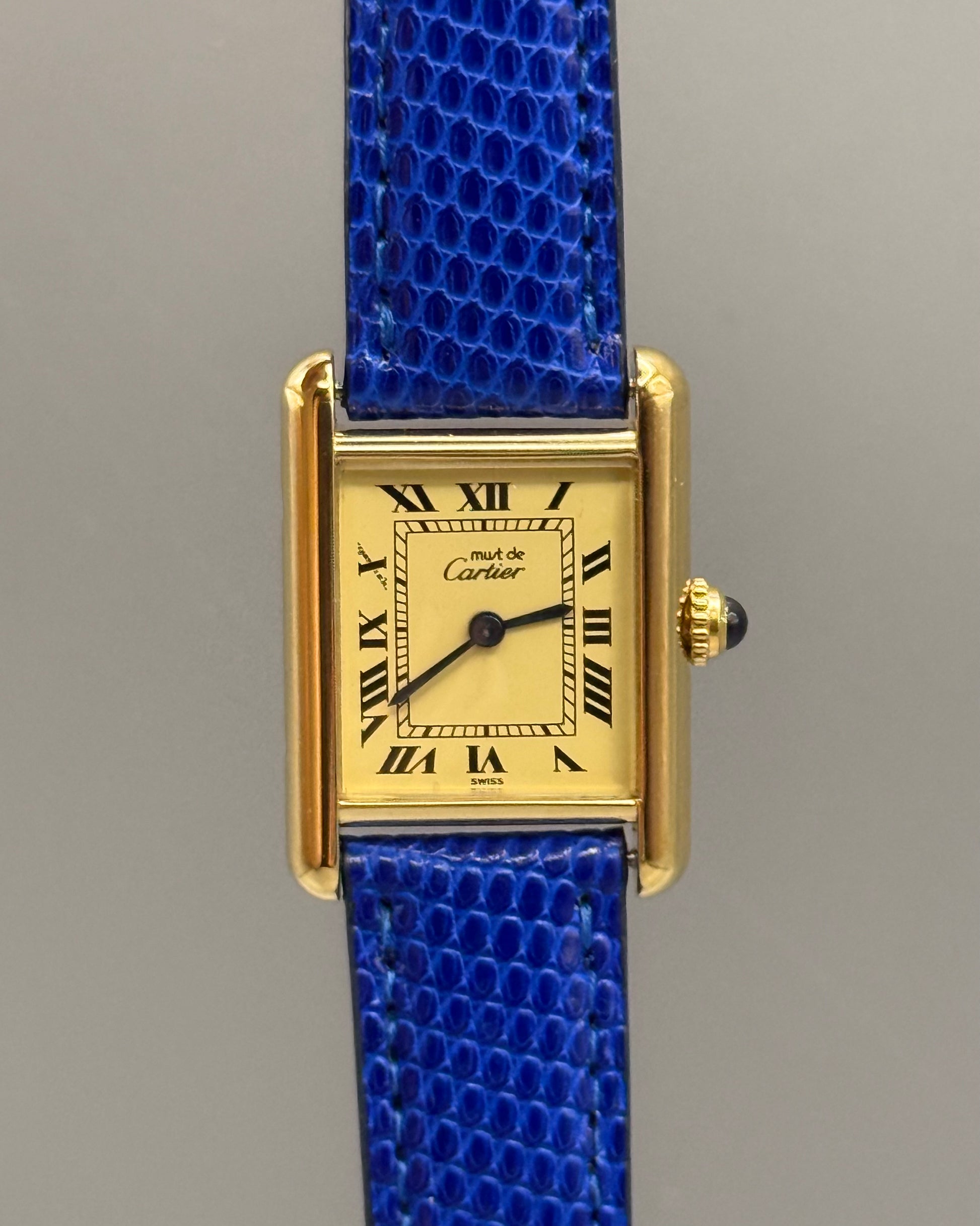 La Tank porte tous les signes distinctifs forts de la Maison Cartier, la minuterie en chemin de fer, les chiffres romains, les aiguilles bleues ainsi que le cabochon de la couronne en saphir.