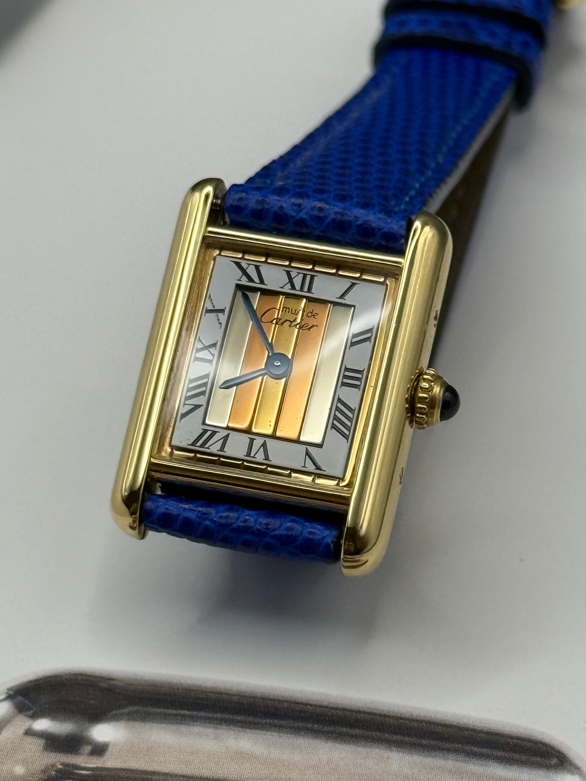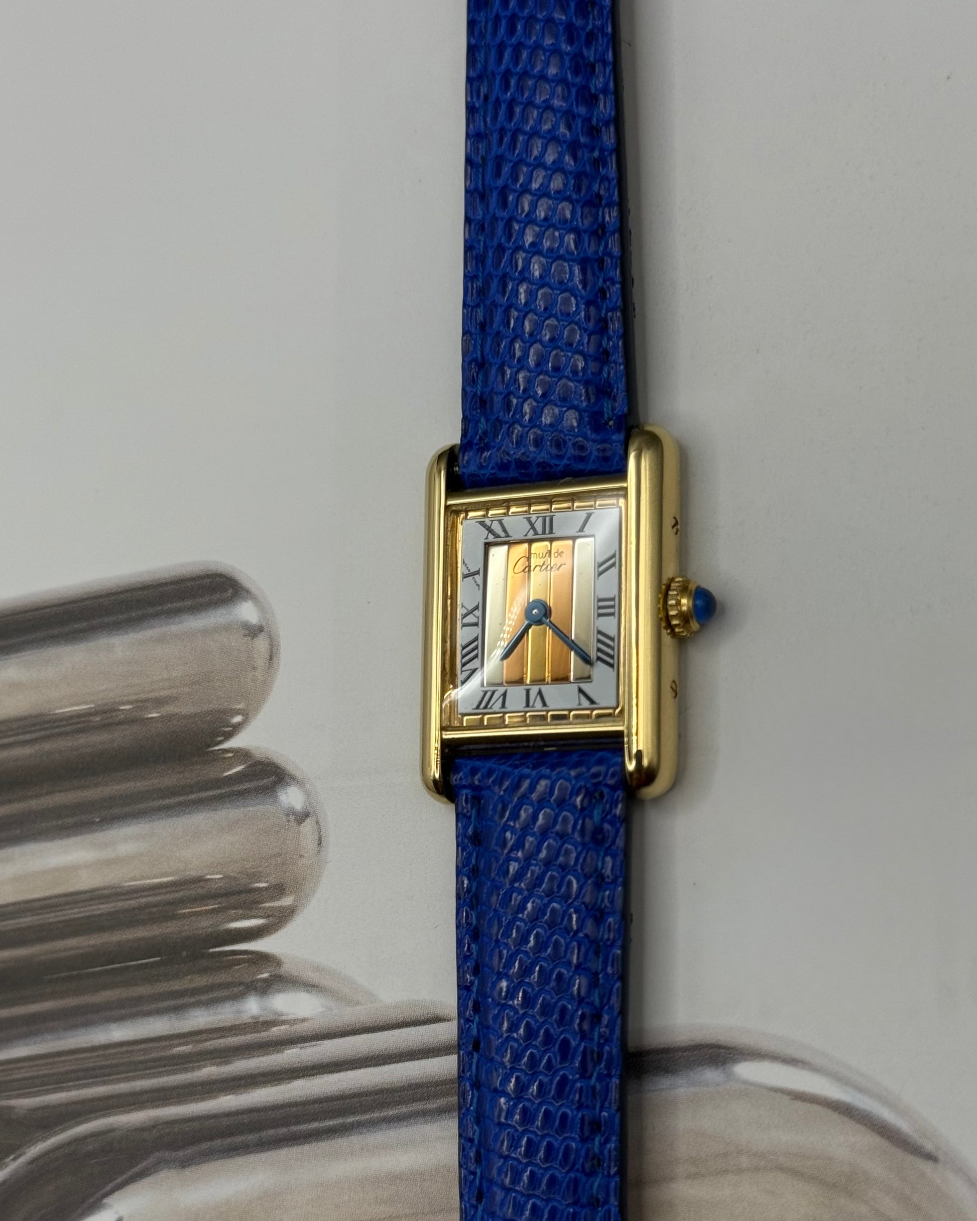 La Tank porte tous les signes distinctifs forts de la Maison Cartier, la minuterie en chemin de fer, les chiffres romains, les aiguilles bleues ainsi que le cabochon de la couronne en saphir.