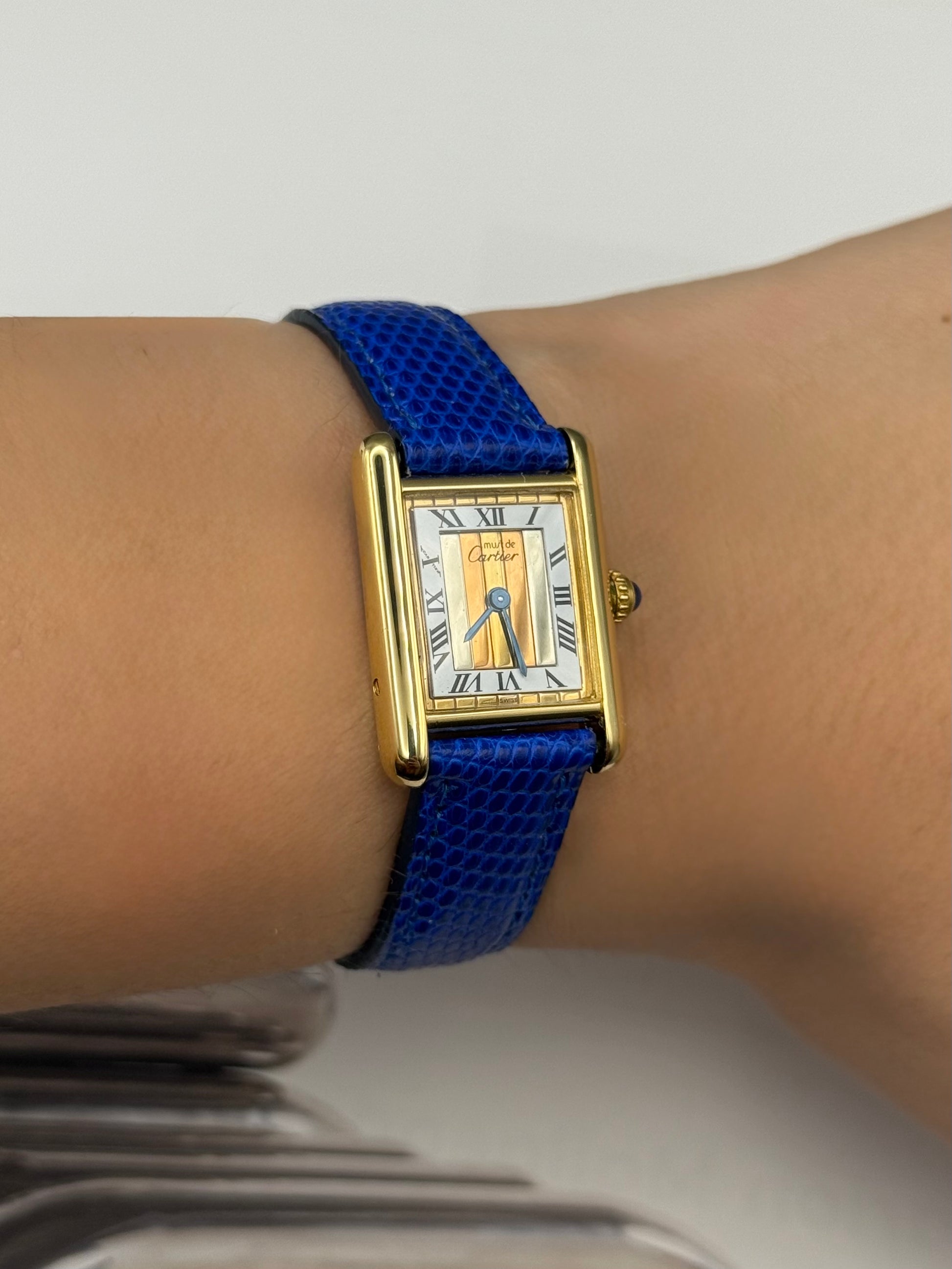 Découvrez notre petite Tank Must cadran Trinity, de seconde main, qui reprend l'esprit de la collection Trinity très appréciée de la Maison Cartier. La parfaite alliance de l'or jaune pour la fidélité, de l'or blanc pour l'amitié et de l'or rose pour l'amour.
