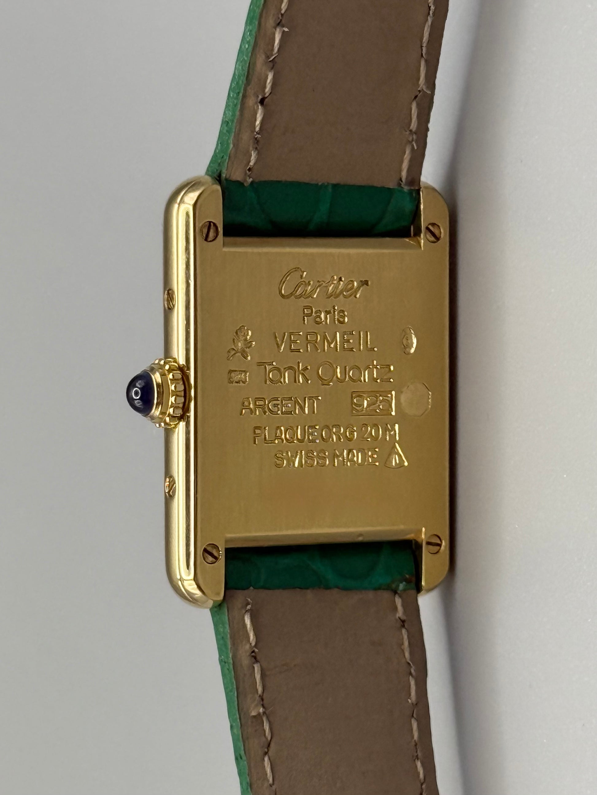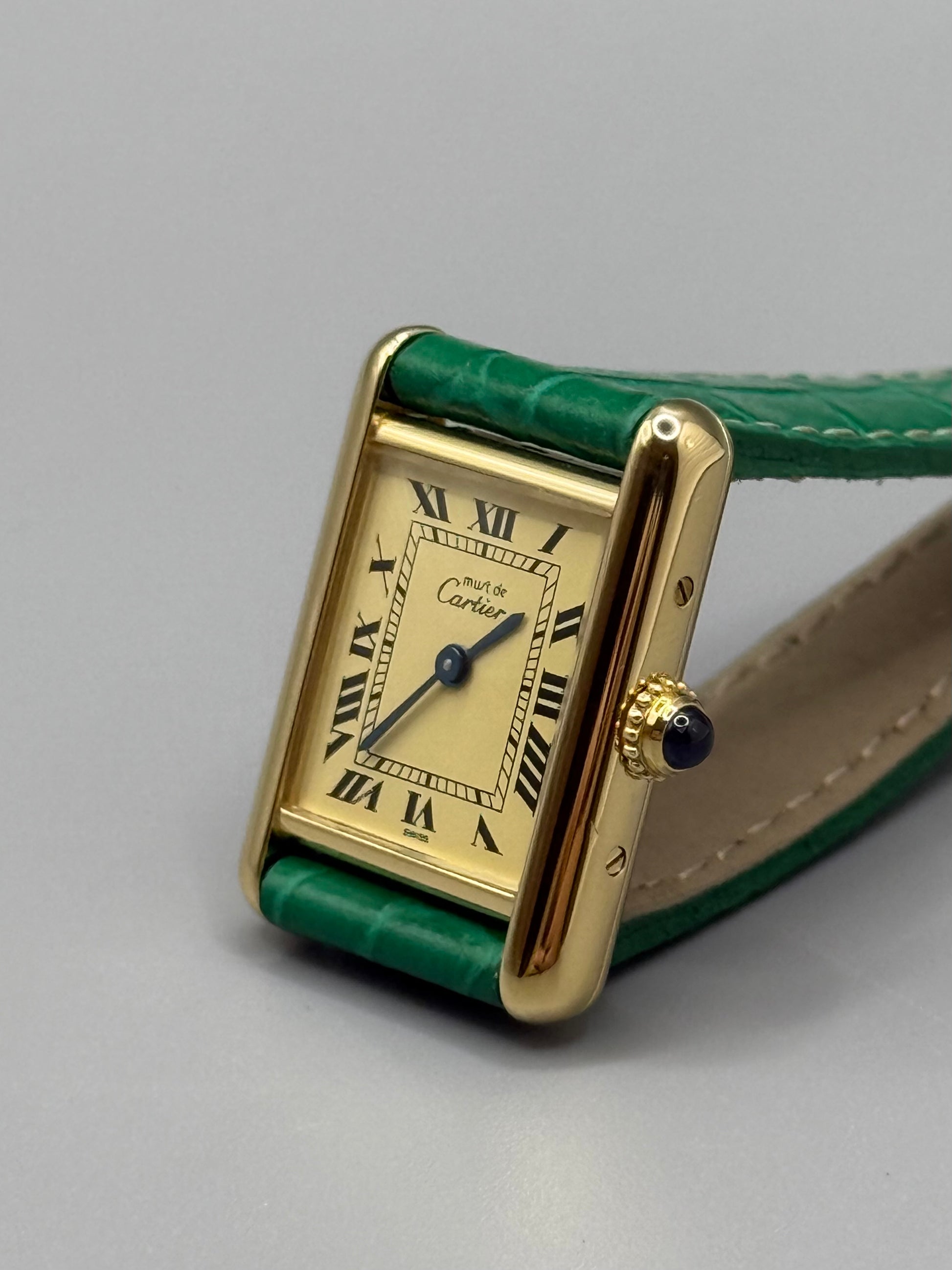La Tank porte tous les signes distinctifs forts de la Maison Cartier, la minuterie en chemin de fer, les chiffres romains, les aiguilles bleues ainsi que le cabochon de la couronne en saphir.